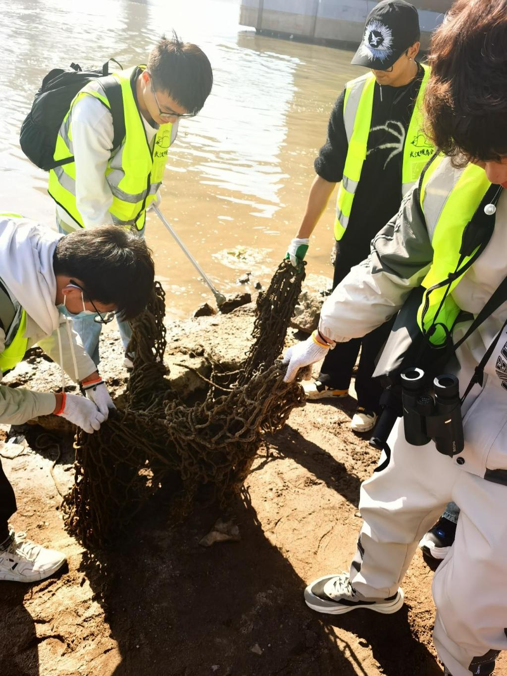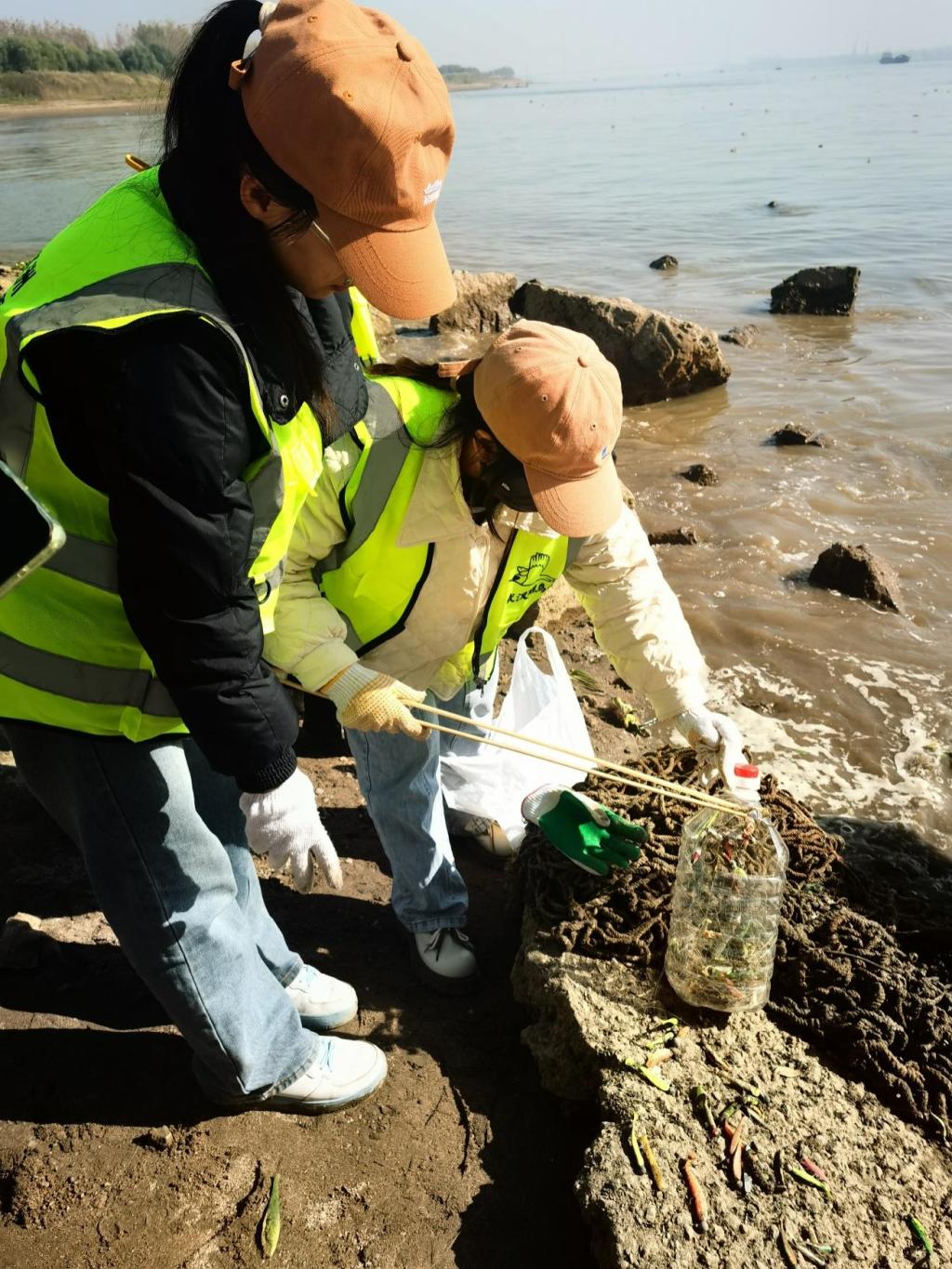 本次志愿活動(dòng)的主要任務(wù)就是在灘涂邊清理人們釣魚所遺留下來的各種魚鉤和魚線。同學(xué)們?cè)诶蠋焸兊膸ьI(lǐng)下走到天興洲大橋下的灘涂和石堆上展開了凈灘工作,有著豐富釣魚經(jīng)驗(yàn)的湯飛老師判斷這一片的魚鉤應(yīng)該不少。