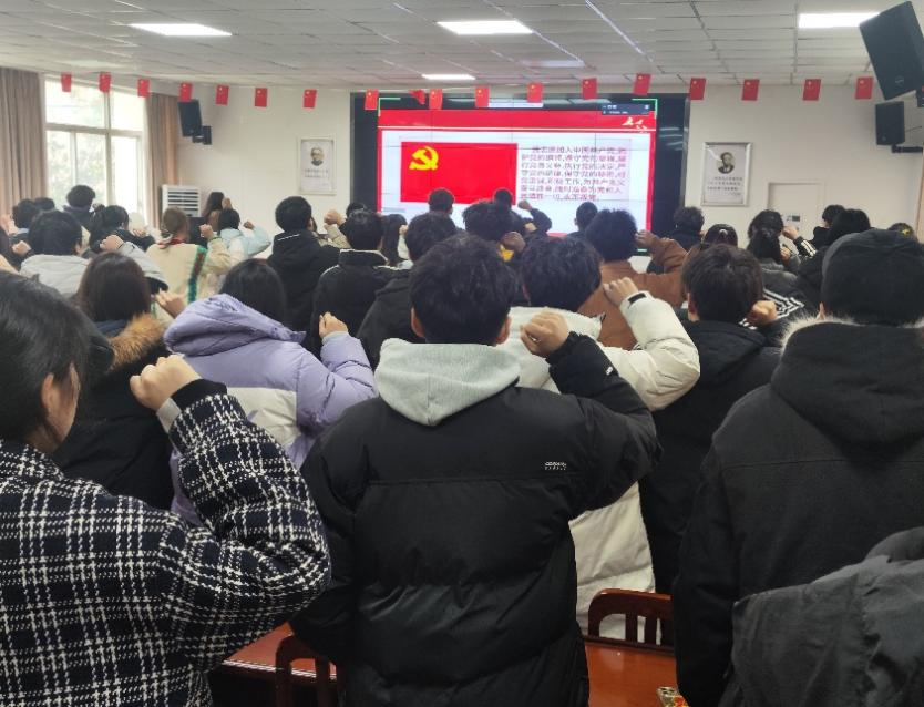 黨支部書(shū)記蘇志俊引領(lǐng)全體成員共同回顧并莊嚴(yán)宣誓入黨誓詞,每一句誓言都擲地有聲,激蕩著每一位同志的心靈深處,激發(fā)起同學(xué)們內(nèi)心澎湃的激情與堅(jiān)定的信念,時(shí)刻銘記入黨時(shí)的初心與使命。