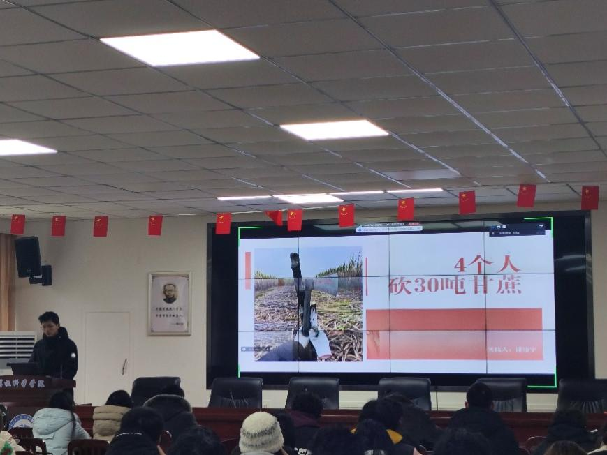 黨支部成員代表何嘉豪、周游、謝沛宇、鄭竣方、徐夢(mèng)茹、李詩(shī)琦6位同學(xué)依次走上講臺(tái),圍繞寒假社會(huì)實(shí)踐、寒假見(jiàn)聞等內(nèi)容開(kāi)展個(gè)人分享,有的同學(xué)結(jié)合個(gè)人經(jīng)歷,傾囊相授參與社會(huì)實(shí)踐的方法和經(jīng)驗(yàn);有的同學(xué)踏上紅色之旅,深入革命圣地,繪聲繪色地講述著一段段令人動(dòng)容的紅色故事,將大家?guī)Щ氐侥嵌尾憠验煹膷槑V歲月,使革命精神在現(xiàn)場(chǎng)傳遞、激蕩;其中,謝沛宇同學(xué)分享了“1天,4個(gè)人,砍30噸甘蔗”的生動(dòng)故事。