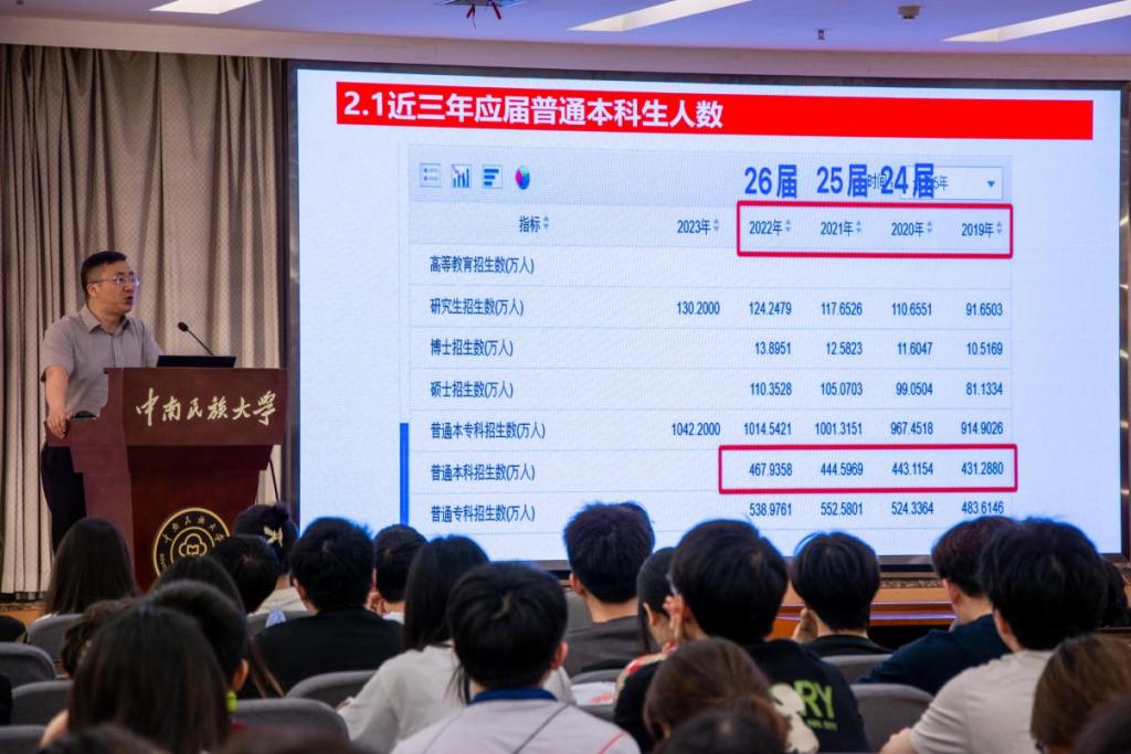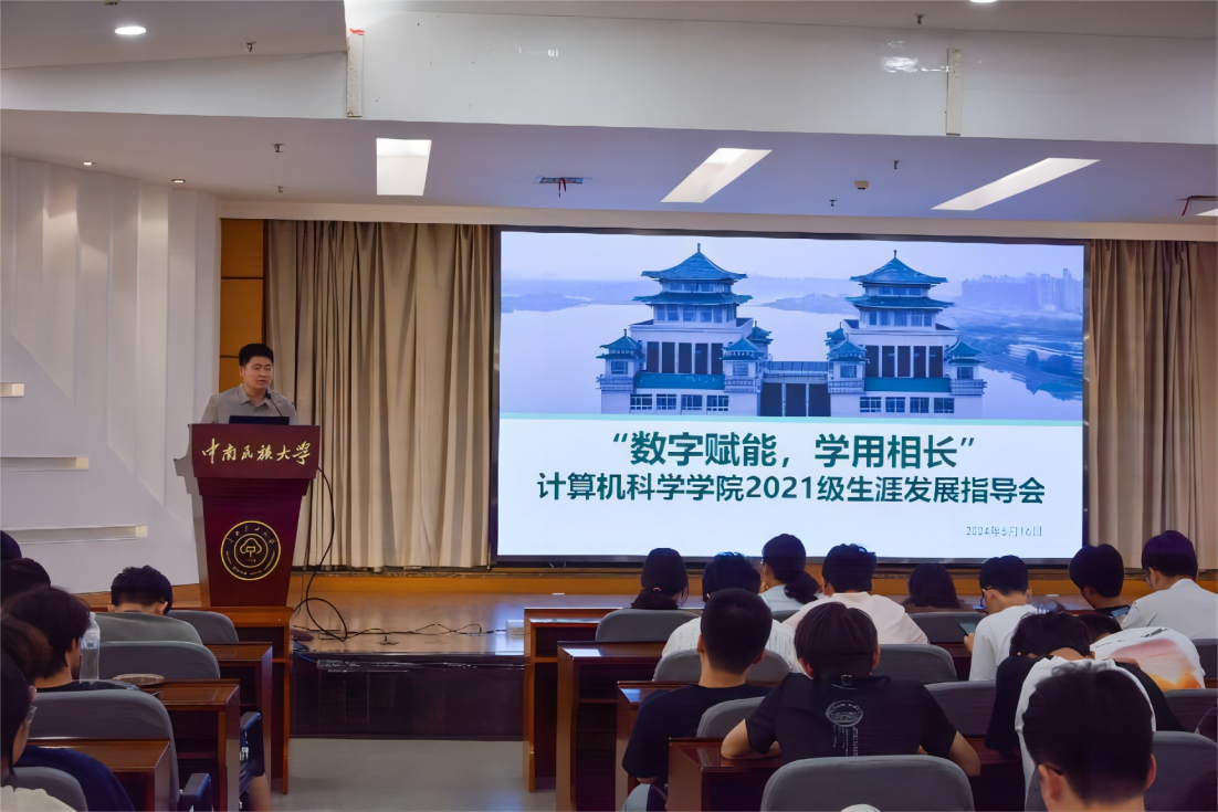 為全面貫徹黨中央、國務院關于促進高校畢業生就業創業的工作部署,落實中南民族大學黨委關于推進就業工作的工作要求,深化計算機科學學院黨委“鑄魂育人、數智強國”黨建工作品牌-黨建引領揚帆計劃之導航工程,提前謀劃學院2025年考研升學就業工作,2024年5月16日晚上6:30,計算機科學學院在潤良報告廳開展以“數字賦能,學用相長”為主題的生涯發展指導報告會,會議邀請萬學教育海文考研湖北分校校長譚曉禹主講,21級本科生全體輔導員參會、學院21級200余名學生參加,報告會由21級本科生輔導員姚欣雨主持。