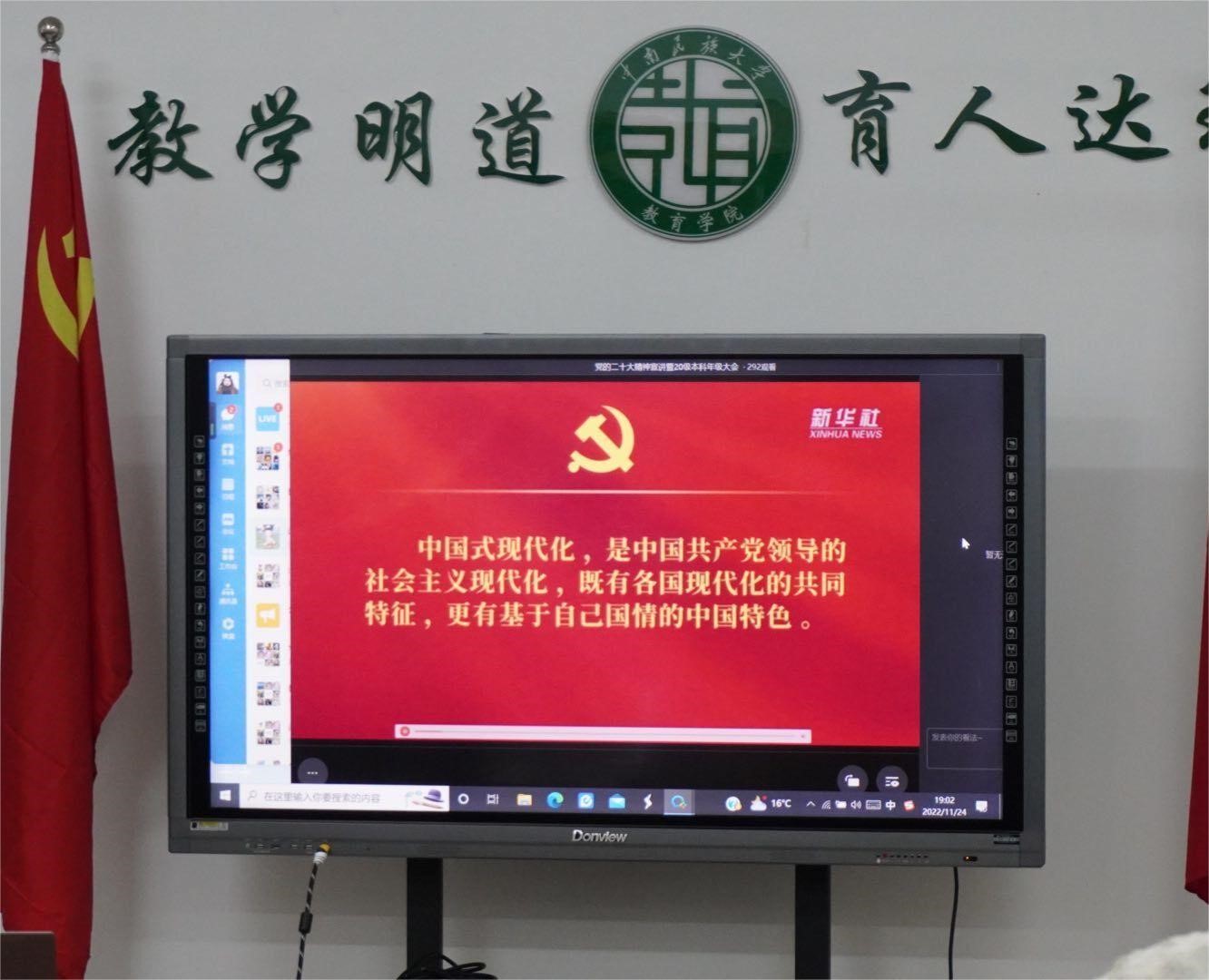 在觀看了黨的二十大精神宣講視頻后,邊境作《深入學習貫徹黨的二十大精神,爭做新時代的好青年》主題宣講。他從深刻領會黨的二十大主題,深刻領會過去5年的工作和新時代10年的偉大變革,深刻領會開辟馬克思主義中國化時代化新境界,深刻領會中國式現代化的中國特色和本質要求,深刻領會全面建設社會主義現代化國家的目標任務,深刻領會教育科技人才、法治建設、國家安全等方面的重大部署,深刻領會堅持黨的全面領導和全面從嚴治黨的重大部署,深刻領會應對風險挑戰的重要要求等8個方面向同學們宣講了黨的二十大精神。他指出,習近平總書記要求全黨把青年工作作為戰略性工作來抓,充分體現了以習近平同志為核心的黨中央對青年工作的重視,2020級本科生要懷抱夢想又腳踏實地,敢想敢為又善作善成,立志做有理想、敢擔當、能吃苦、肯奮斗的新時代好青年,為實現中華民族偉大復興的中國夢作出應有的貢獻。