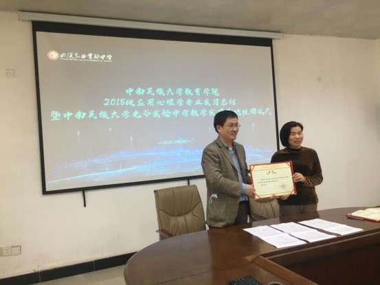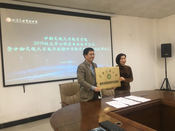 2021年4月30日下午,我院2018級應用心理學專業實習總結大會暨中南民族教育學院教學實習基地掛牌儀式在光谷實驗中學舉行。光谷實驗中學譚小娟副校長、我院羅建河副院長、孫冰副書記、趙冬梅老師、鮑旭輝老師、實習生代表及光谷實驗中學部分教師代表參加了本次會議,會議由趙冬梅老師主持。