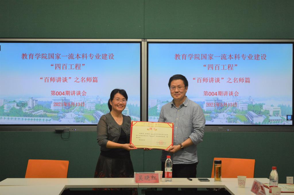 5月13日,中南民族大學教育學院“四百工程”——“百師講談”之名師篇第004期講談會在15棟733教室順利舉行。本次講談會的主講人為武漢第三寄宿中學、武漢第三初級中學吳曉紅校長。教育學院羅建河副院長與汪丞教授、本科學生參加了本次講談會,羅建河副院長代表學院向吳校長頒發了“國家級一流本科‘教育學’專業實踐導師”與“教育碩士專業實踐導師”聘書。