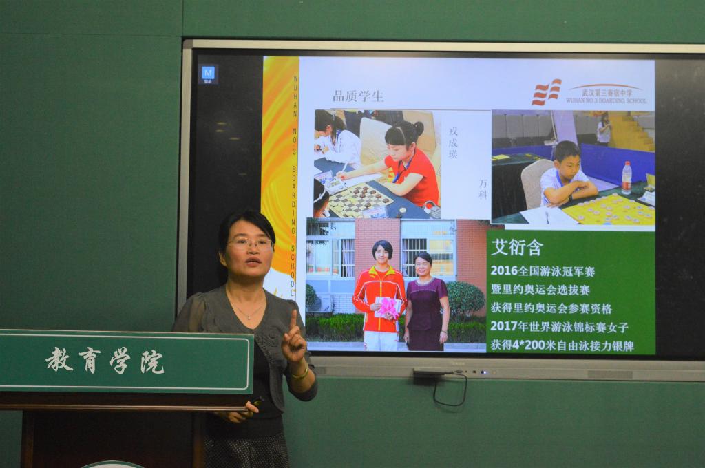 吳曉紅校長本次演講的主題是“新時代呼喚‘四有教師’”。吳校長首先闡述了“四有教師”的內涵,“四有”好教師須有理想信念,有道德情操,有扎實知識,有仁愛之心。吳校長列舉了武漢第三寄宿中學具體的教學實踐活動與生動的學生培養實例,向同學們介紹了真實的學校教育,教師所面對的是學生的特殊性和多變性,在復雜多變的教育教學實踐中,教師需具備超前的意識與創造性,引導學生成長。隨后,吳校長闡述了新時代教育發展背景下,教師需具備“以天下為己任”的崇高職業意識與時代擔當,成為新時代的“四有教師”,這在學生成長中起到不可替代的作用。