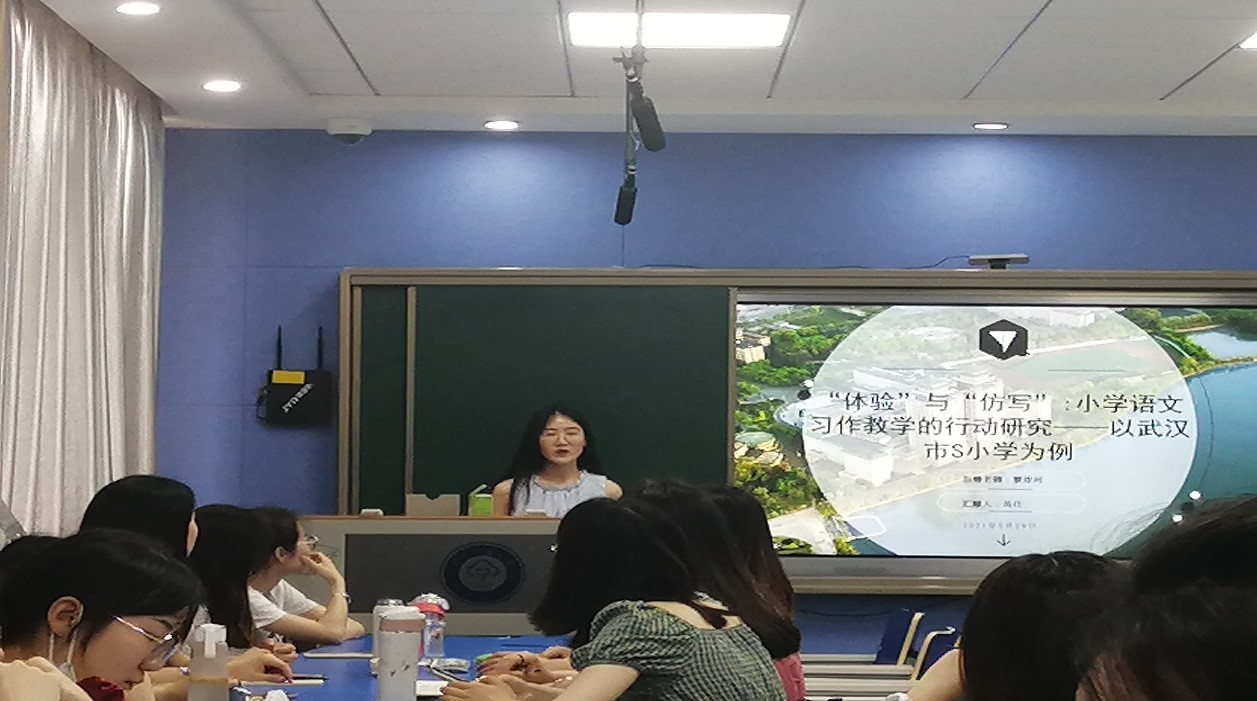 黃佳論文題目是《 “體驗”與“仿寫”:小學語文習作教學的行動研究——以武漢市S小學為例》,她分別從論文寫的是什么、為什么寫、怎樣寫、研究結論、研究創新不足五個方面作了匯報。隨后,提出了論文寫作的若干建議:論文選題應在文獻閱讀、當前研究熱點及教育實踐中發現問題,定題時應該保證研究的科學、嚴謹。調查研究方式的選擇要盡量規范,問卷的量表要參考權威人士的研究成果和有關理論,避免出現支撐力不夠等問題。在論文答辯時應該態度端正、聲音洪亮、控制時間等。