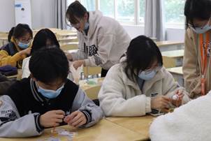在212教室,心理站成員為同學們演示如何將毛線給羽毛球編織出新衣。在編織過程中,心理站成員給同學們一個一個進行詳細指導,將復雜的動作拆解成更為細致的步驟。