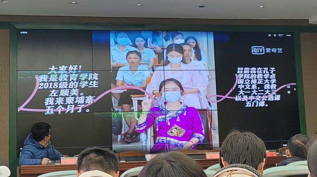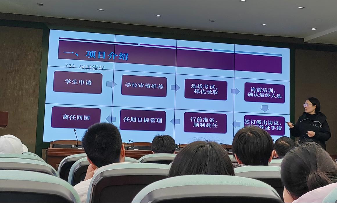 宣講會(huì)上,學(xué)院以視頻的形式展示了18級(jí)畢業(yè)生張?zhí)飓h、左順美當(dāng)前在柬埔寨的工作、生活情況。隨后,國(guó)際交流合作處李楠老師從項(xiàng)目簡(jiǎn)介、申請(qǐng)條件和程序、崗位信息介紹、待遇和管理及赴任前須知等五個(gè)方面對(duì)國(guó)際中文教育志愿者項(xiàng)目進(jìn)行了詳細(xì)的說明。