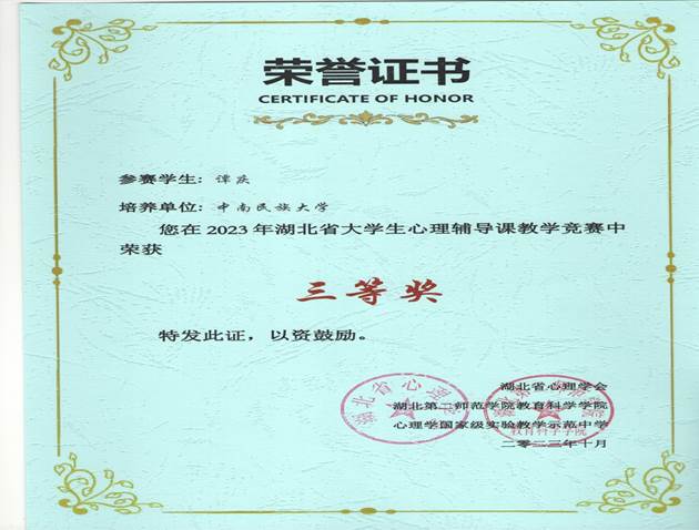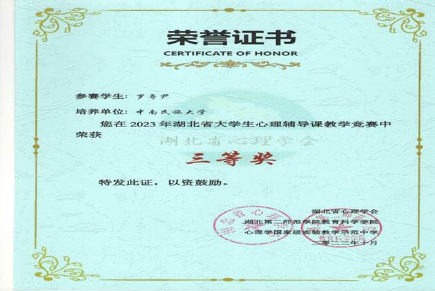 2023年10月22日,2023年湖北省大學生心理輔導課教學競賽落幕,我院應用心理學專業(yè)本科生羅粵尹、譚慶、熱依沙·如孜買買提都獲得三等獎。