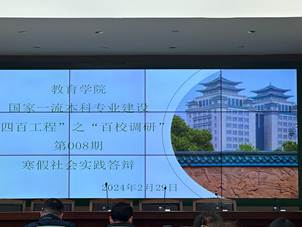 2024年2月29日中午,中南民族大學教育學院在15棟教學樓733教室和741教室舉行了寒假社會實踐答辯會。本次答辯會由姚林老師、魏立才老師、趙冬梅老師和胡炳仙老師擔任評委,總計有24支隊伍參加評比。