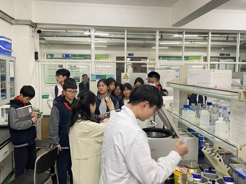 師生們隨后探訪了生命科學(xué)學(xué)院的實驗室,一場生動的科學(xué)之旅在此展開。在這里,一群身著整潔“白大褂”的研究生們熱情洋溢地迎接了來訪的師生們。他們耐心而細致地為大家介紹了實驗室中的各類實驗器材,其中日光模擬器、培養(yǎng)皿等先進設(shè)備尤為引人注目。隨著研究生們的講解,同學(xué)們仿佛置身于一個充滿奧秘的微觀世界。他們瞪大了眼睛,仔細觀察著這些平時難得一見的實驗器材,內(nèi)心充滿了好奇與驚嘆。科學(xué)研究的魅力在此刻得到了淋漓盡致的展現(xiàn),同學(xué)們的興趣被迅速點燃。