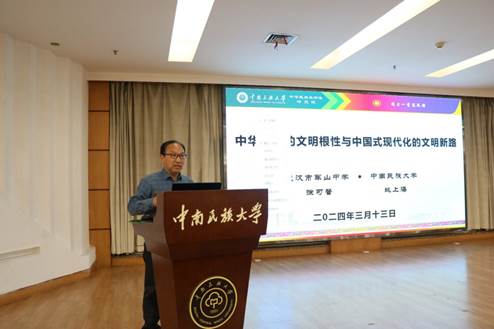 活動的高潮部分,姚上海教授為師生們帶來了一場精彩絕倫的講座。他深入剖析了《中華民族的文明根性與中國式現(xiàn)代化的文明新路》,從四個維度——地理環(huán)境、經(jīng)濟特點、政治制度和文化觀念,全面而深刻地解讀了中華民族文明崛起的內(nèi)在動力和精神文化基因。幾千年來,中華民族之所以能夠生生不息,薪火相傳,靠的是我們中華民族精神永不泯滅,靠的是國土不可分、歷史不可斷、民族不可散的理念。中國現(xiàn)代化的過程與西方走的是完全不同的道路,我們立足于中國統(tǒng)一多民族國家基本國情,走出了一條富有中國特色、繼承中華民族優(yōu)秀傳統(tǒng)的現(xiàn)代國家建設(shè)道路?!拔覀円龑?dǎo)學(xué)生們牢固樹立‘休戚與共、榮辱與共、生死與共、命運與共’的共同體理念,不斷增強對偉大祖國、中華民族、中華文化、中國共產(chǎn)黨、中國特色社會主義的認同,鑄牢中華民族共同體意識?!币淌谠谥v座中深情地說道。