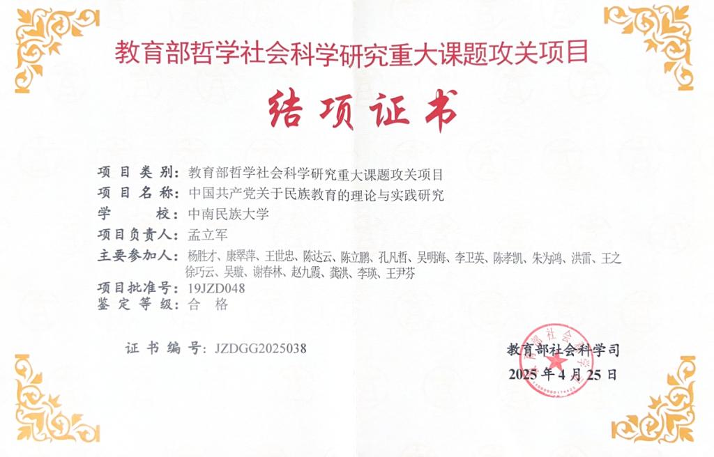 經(jīng)教育部社會(huì)科學(xué)司審核,該項(xiàng)目符合《教育部人文社會(huì)科學(xué)研究項(xiàng)目成果鑒定和結(jié)項(xiàng)辦法》規(guī)定,鑒定等級(jí)為“合格”(項(xiàng)目批準(zhǔn)號(hào):19JZD048,證書(shū)編號(hào):JZDGG2025038)。《中國(guó)共產(chǎn)黨關(guān)于民族教育的理論與實(shí)踐研究》項(xiàng)目聚焦中國(guó)共產(chǎn)黨領(lǐng)導(dǎo)下民族教育的發(fā)展脈絡(luò),系統(tǒng)梳理理論成果與實(shí)踐經(jīng)驗(yàn),對(duì)于鑄牢中華民族共同體意識(shí)、推動(dòng)民族地區(qū)教育現(xiàn)代化具有重要理論和現(xiàn)實(shí)意義。