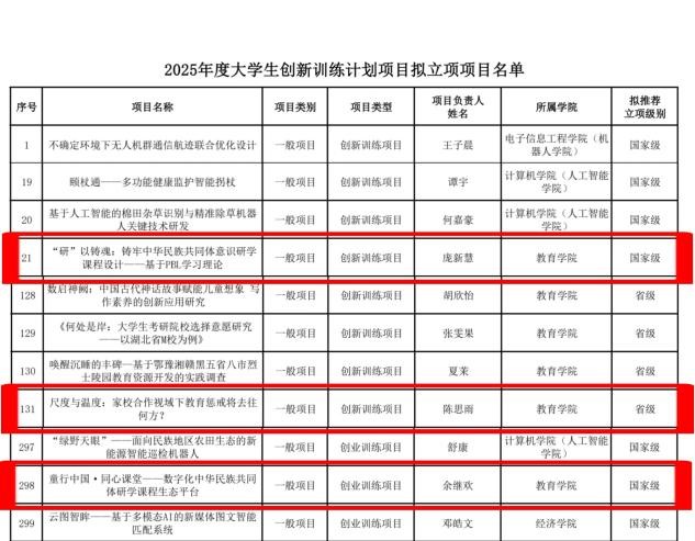 項目以鑄牢中華民族共同體意識為主線,面向中小學生開展跨學科鑄牢活動課程。項目組基于教學實踐,成功申請大學生創(chuàng)新訓練項目立項2項,其中《“研”以鑄魂:鑄牢中華民族共同體意識研學課程設(shè)計——基于PBL學習理論》榮獲國家級立項;《尺度與溫度:家校合作視域下教育懲戒將去往何方?》榮獲省級立項。在創(chuàng)業(yè)訓練項目賽道,項目組研究成果《童行中國·同心課堂——數(shù)字化中華民族共同體研學課程生態(tài)平臺》榮獲國家級立項。在中南民族大學2025年“挑戰(zhàn)杯”大學生課外學術(shù)科技作品競賽中,項目組成員基于實踐反思《尺度與溫度——家校合作視野下教育懲戒問題調(diào)研》項目榮獲一等獎。此外,項目組在志愿服務(wù)領(lǐng)域也獲得認可?!巴臉穼W”團隊與“勇敢面隊”成功入圍2025年校級寒假社會實踐活動優(yōu)秀團隊;榮獲2025年中南民族大學志愿服務(wù)優(yōu)秀團隊。
