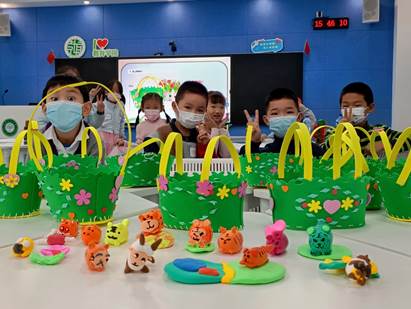 《民族節日》主要由折紙粽子、做紙葫蘆、手工編織等活動組成。意在通過系列活動,讓學生初步體驗不同節日習俗,培養學生團結協作、熱愛祖國的優良品質。課程先講授漢族的端午節,通過視頻引入滿族五月節,讓學生感受習俗文化間的異同。接著開展了 “探秘土家族”活動,老師講解土家族的圖騰文化,帶領學生用超輕粘土捏老虎。最后,教師引導學生動手編織手提籃,感受土家族編織文化的魅力。