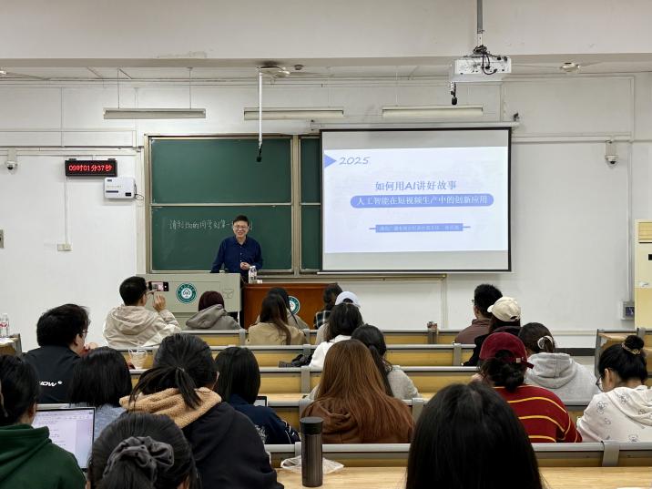 張昌旭主任結合自身30余年新聞工作經驗與近百部紀錄片專題創作實踐,從AI與短視頻的演進切入,梳理技術從“實驗室”到“平民化”的發展脈絡。他指出,AI技術突破的核心邏輯在于解決短視頻創作痛點,不僅要提升素材處理效率、增強敘事感染力,更要提高傳播參與度;針對AI短視頻創作的認知誤區,他澄清AI短視頻需要懂編程算法、數字人制作成本高、AI生成內容皆為假的三大誤區,緩解學生對技術的畏難心理;圍繞AI短視頻創新,他分享技術創新路徑并強調倫理底線,講解“四步法”實戰指南;談及AI時代的創作者定位,張昌旭主任明確指出AI不會代替創作者,并提出學生需重點培育人文敘事能力、AI提示詞工程能力與倫理判斷能力。