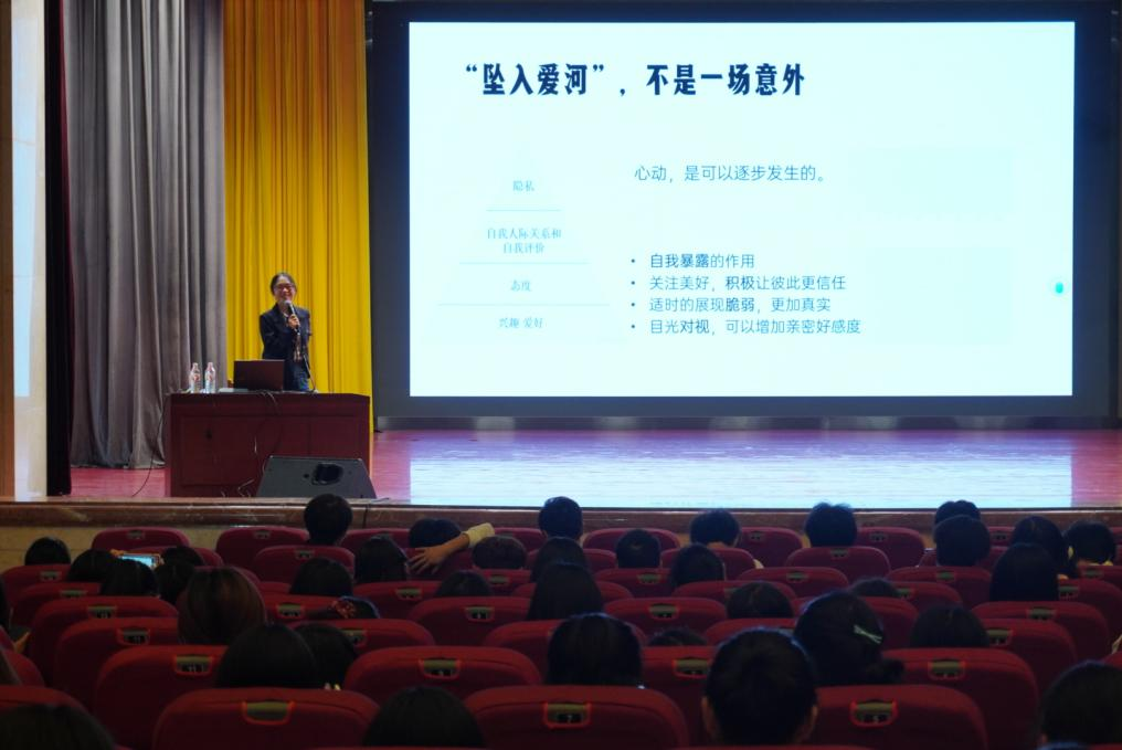 劉芊滋老師從從多個視角切入,生動回答了“愛是什么?”,接著指出“我們探討的重點不是愛是什么,而是愛包含了什么”,由此又介紹了愛情三元理論——愛情由激情、親密和承諾三部分組成。在講座中,劉老師借助愛情地圖理論講述了愛情是可以培養的,并強調在愛情培養中用好接近性、相似性、相互性和吸引力這四個原則。