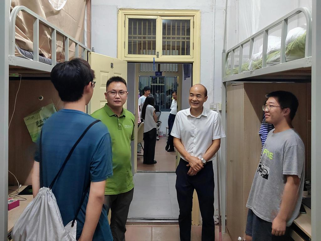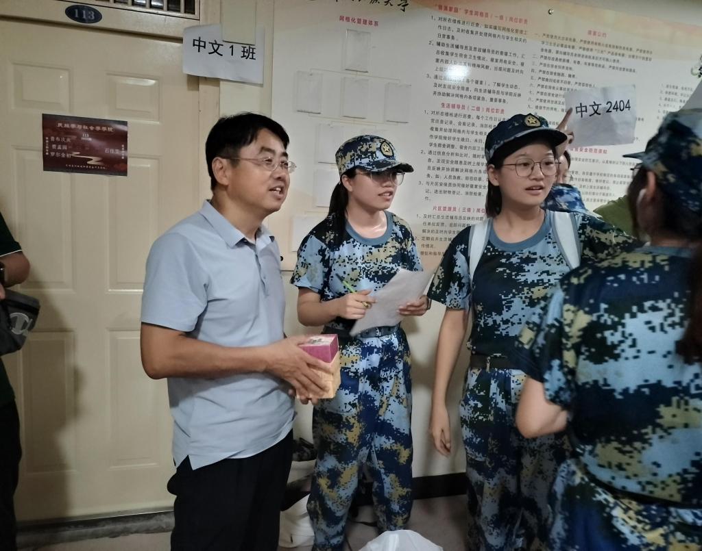 9月13日晚,學院黨委書記謝嵐、院長陶喜紅、副書記牛磊和班導師一行,在輔導員的陪同下,走進學生軍訓隊伍。