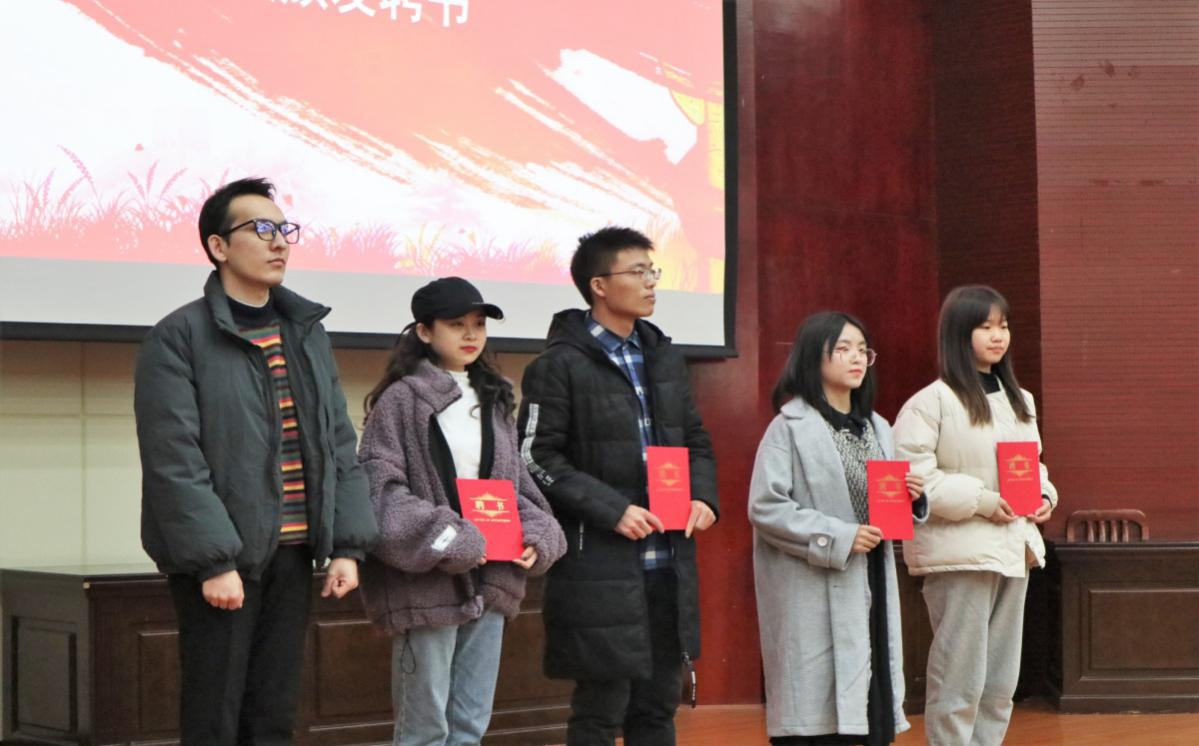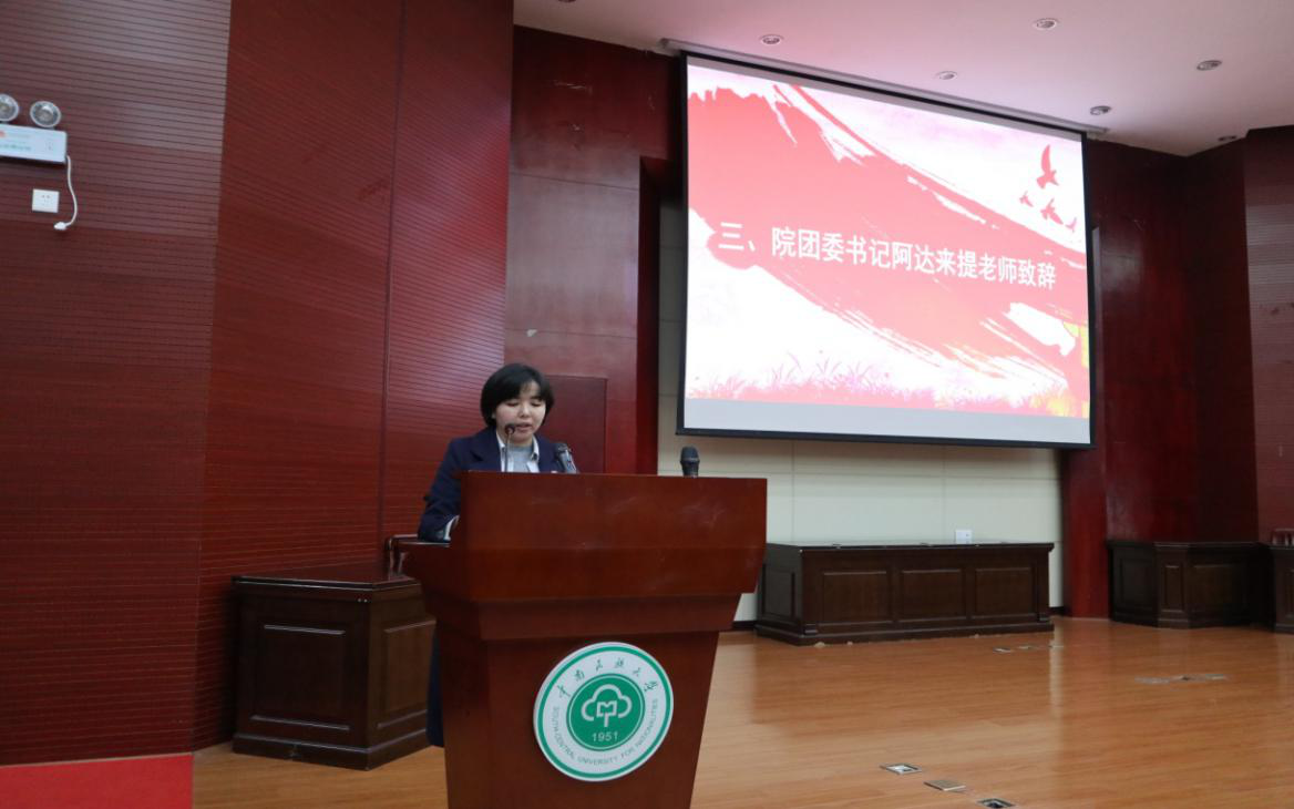 大會對優秀團員、優秀班級和最佳組織獎班級進行了表彰,并宣讀了第七屆基層團校對謝浩、魏祎、蘭孜、李懿婧四位帶班人的聘任文件。張書記和阿達來提老師進行頒獎,卡迪爾旦老師為四位帶班人頒發聘書。阿麗米熱·牙克木江代表優秀團員發言,總結了她的學習經驗和學習心得。李懿婧同學代表四位帶班人進行發言,她表示希望同學們不忘初心,腳踏實地投身實踐,砥礪前行。