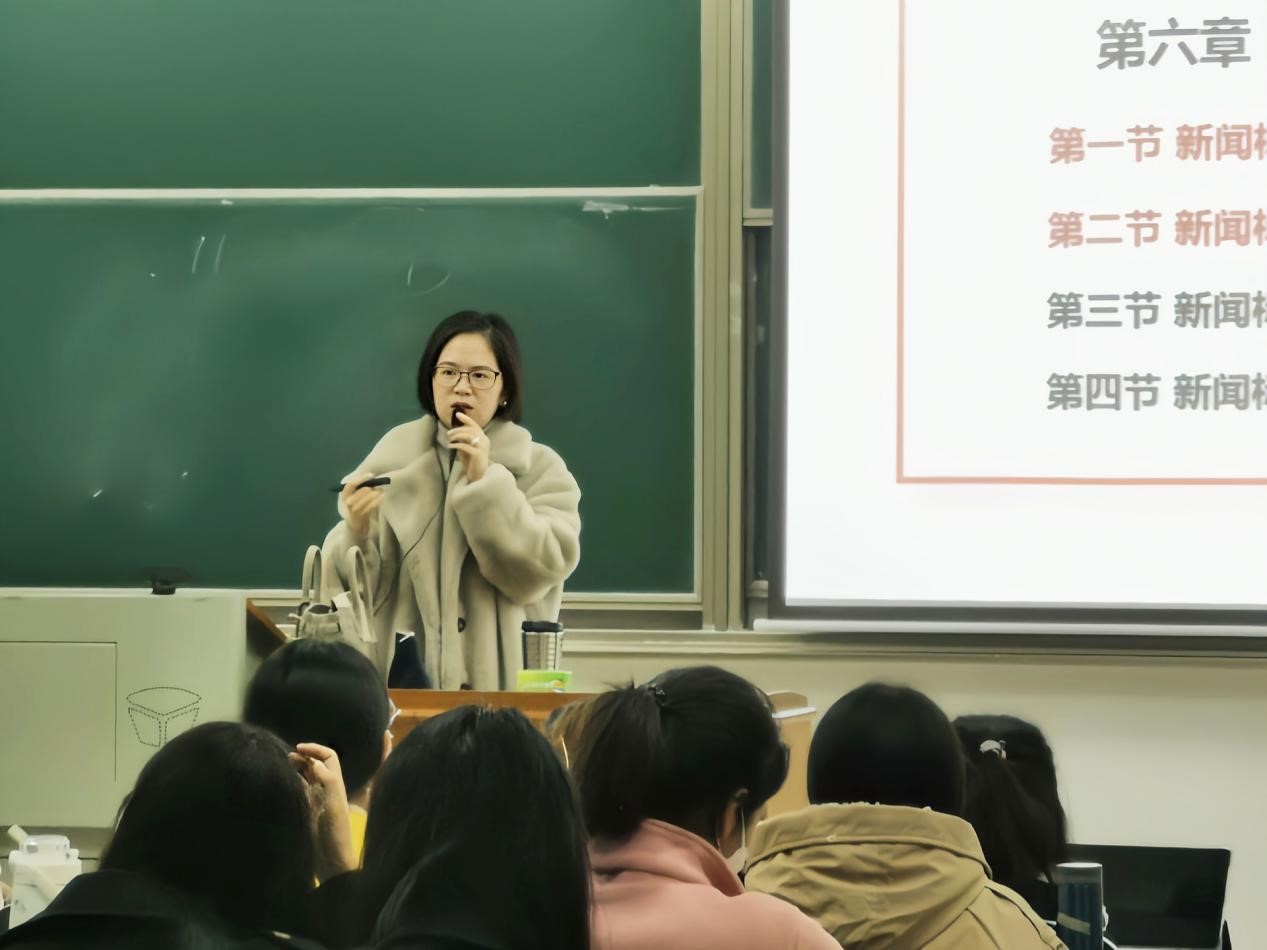 在課堂中,田園子老師十分注重將思政教學元素融入專業課程之中,寓價值觀引導于知識傳授之中,積極引導同學們形成正確的新聞理念。“新聞編輯無小事,一個標點的失誤就可能造成截然不同的解讀從而引起嚴重的后果。”她向同學們強調了新聞的專業性,指出一名合格的新聞編輯必須堅持黨性原則、真實性原則,對于報道性新聞不僅要告訴受眾發生什么,還要告訴受眾如何正確看待,在撰寫報道時褒貶適度、分寸得當。課后,新聞支部的幾位老師與田園子老師交流課程思政的目標與做法。