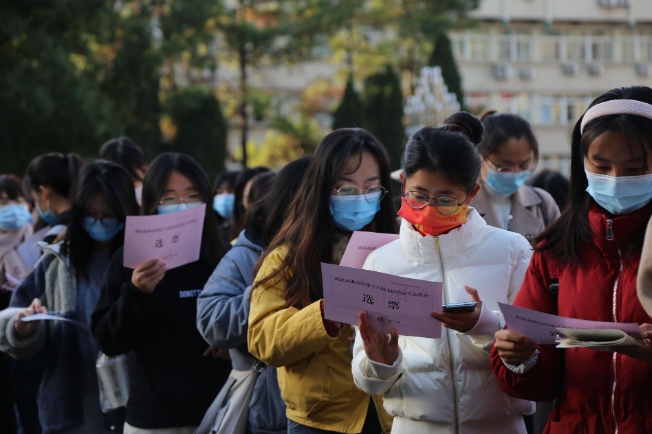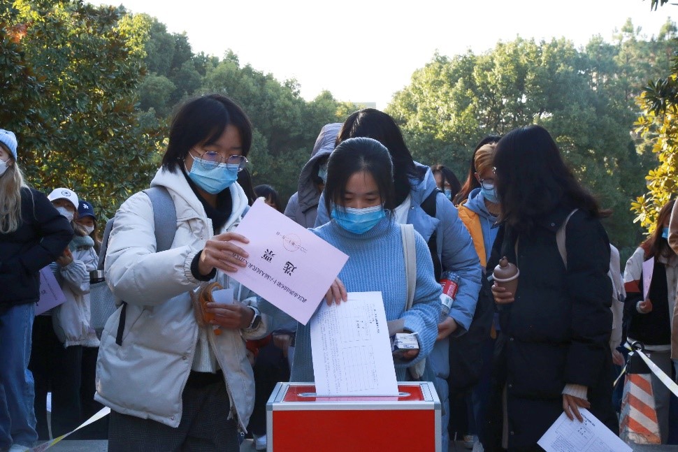選舉當天,我院全體選民于校訓石前集合,按照疫情防控要求、依次有序地進行換屆選舉投票工作,選民們在票箱前莊嚴地投入屬于自己神圣且寶貴的一票。