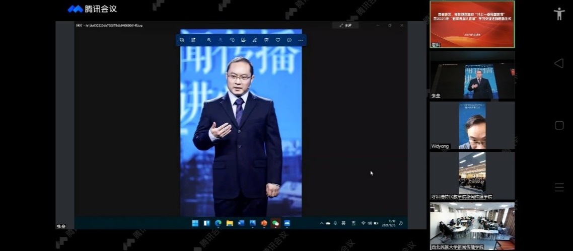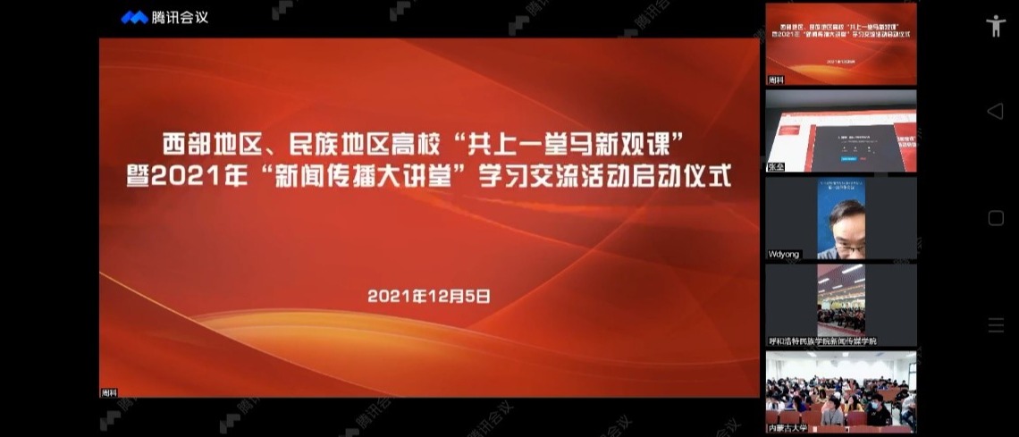本站訊(通訊員王曉慶 攝影王曉慶)為深入貫徹落實(shí)習(xí)近平總書記最新重要講話精神,全面落實(shí)立德樹人根本任務(wù),培養(yǎng)卓越新聞傳播后備人才,加強(qiáng)西部地區(qū)、民族地區(qū)高校新聞傳播院系協(xié)同育人機(jī)制建設(shè),共享新聞傳播優(yōu)質(zhì)教育資源,由中央民族大學(xué)新聞傳播學(xué)院牽頭組織,西部地區(qū)、民族地區(qū)15所高校新聞傳播院系聯(lián)合主辦的西部地區(qū)、民族地區(qū)高?!肮采弦惶民R新觀課”暨2021年“新聞傳播大講堂”學(xué)習(xí)交流活動(dòng)啟動(dòng)儀式于2021年12月5日14點(diǎn)整采用直播的方式在騰訊會(huì)議召開。在我院組織下,2020、2021級(jí)新聞傳播學(xué)類全體同學(xué)參與直播會(huì)議,本次會(huì)議主持人為中央民族大學(xué)新聞與傳播學(xué)院毛湛文副院長(zhǎng)。