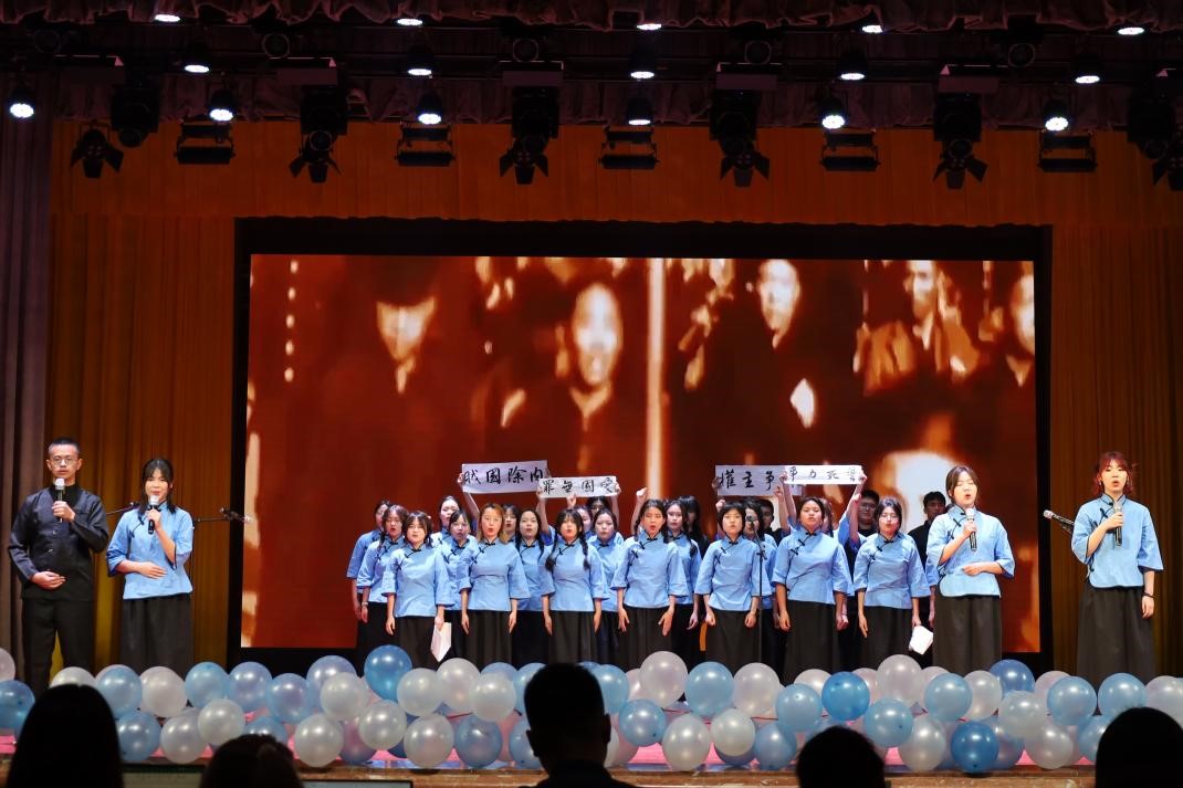 朗誦現場,文傳學子們以頌詞歌青春,以言語展風采,結合歌唱、話劇、舞蹈等多種形式將百年韶華高聲歌唱。由中文2101班帶來的《寫給未來的你》詩歌朗誦中,同學們在飽含情感的歌頌中傳唱出青年一代“擼起袖子加油干”的堅毅。新傳2107班帶來的《百年風華,盛世如愿》朗誦中,同學們穿著藍衫,生動再現了華夏兒女在百年之間用自己的雙手共同描繪的新時代畫卷,朗誦過程中揚起的國旗匯聚成了一道鮮艷的中國紅,象征著熱忱、奮進、團結的民族品格,彰顯著中國人的文化圖騰和精神皈依。縱觀歷史長河,舉目未來之路,同學們情感變幻的吟詠,鏗鏘有力的朗誦,無不體現著吾輩恰同學少年風華正茂,時刻堅定為家國而奮斗終生的信念和共迎嶄新時代的憧憬。16個班級的表現贏得了觀眾的強烈共鳴,臺下掌聲不斷。