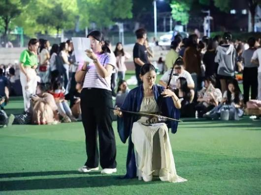 皓月當空,清風徐徐。新生以班級為單位,圍成同心圓,在班助的帶領下,各式才藝輪番上演。“當山峰沒有棱角的時候,當河水不再流,當時間停住日夜不分……”《當》的旋律剛起,大家便不約而同合唱起來;古典扇子舞靈動飄逸;二胡弦聲悠揚;雙節(jié)棍一套點、掃、劈、撩動作更是令人拍手叫絕。更有我院文工團助演的舞蹈《Tomboy》、歌曲《玫瑰少年》、話劇等節(jié)目點燃全場!新生氣氛活躍,反響熱烈。
