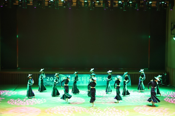收到演出邀請后,我院文工團倍感榮幸并高度重視本次的演出任務。在賽前排練中,大家嚴摳動作細節,多次喊停與重來,確保舞蹈的美感與力量感。最后,文工團以干凈利落、扣人心弦的出色表現獲得了在場觀眾的一致好評。與此同時,在這場科普大賽中,舞者用一種大眾喜聞樂見的方式向觀眾科普了花腰傣舞蹈,實現了舞蹈與科普的巧妙融合。