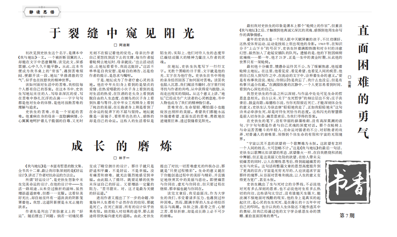 我院學生再讀經典,發表了《于裂縫中窺見陽光》、《成長的磨煉》、《直面困難的勇氣》三篇讀后感。史鐵生走了,但他的精神永存,從史鐵生筆下的地壇感悟人生百態。通過他的文字學會感恩生命的饋贈,重拾直面困難的勇氣。