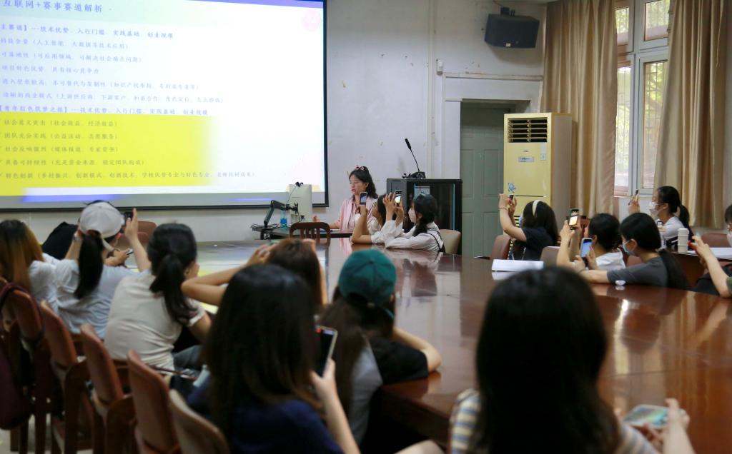 首先從豐富的賽道種類引入講解,夏瑞婷著重分析了“互聯網+”大學生創新創業大賽的高含金量,緊接著她又從技術優勢、入行門檻、實踐基礎、創業規模這四個方面對“互聯網+”賽事進行了分析。對于同學們困擾的幾個問題,她耐心地展開回復,解答了關于賽事初心、獲獎路徑、選擇團隊伙伴及指導老師等多方面的疑問。