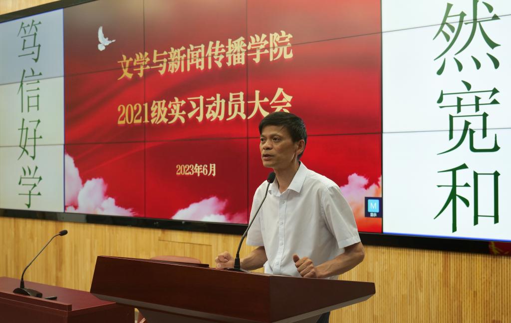 本站訊(通訊員馬曉怡 攝影鄭爽)為進一步激發學生實習熱情,明確實習目標,在暑期更好的適應實習活動。6月16日下午,我院在文一樓101教室召開2021級實習動員大會。長江智庫研究院院長、湖北長江商報總編輯劉義忠受邀出席會議。我院院長陶喜紅、黨委副書記張文軍、副院長陳嘯出席會議,2021級暑期實習學生參加會議。會議由2021級輔導員龔觀主持。