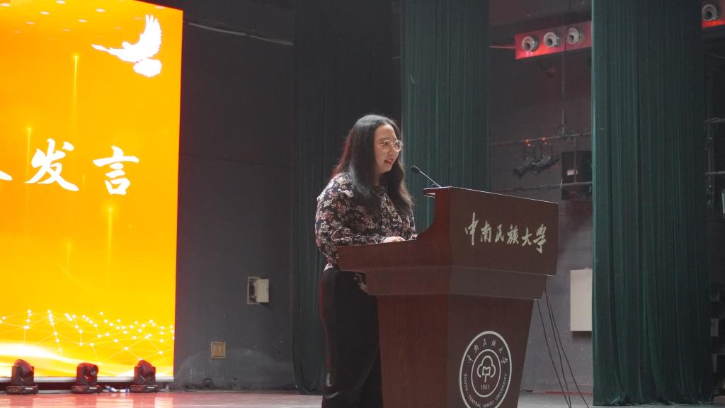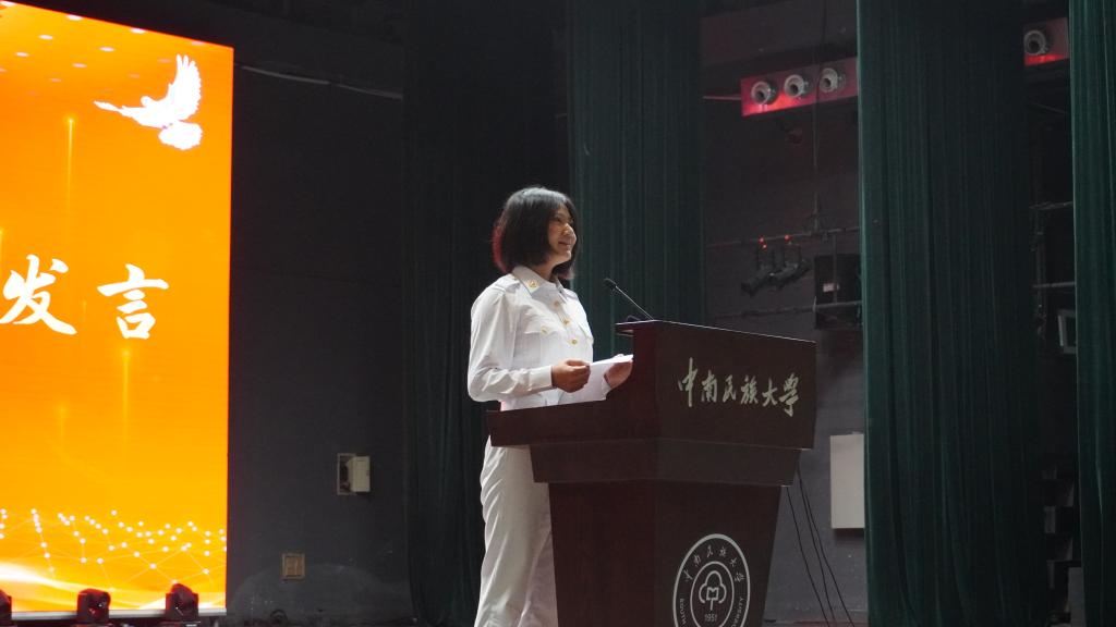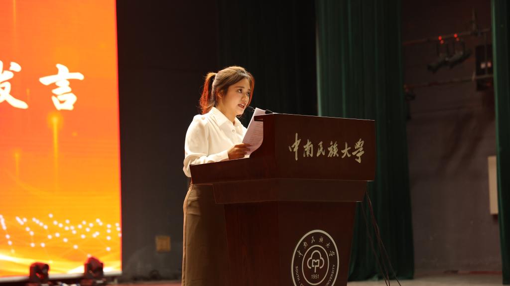 老生代表2021級本科生朱璇向全體新生分享成長感悟:在學習上同學們需探索適合自身的學習方式,并在實踐中將所學理論外化于行,提升專業素養;2023級本科生代表李啟蓉在今年告別軍營生活,重返民大校園。在發言中她表達對重返校園生活的喜悅與未來生活的憧憬;2023級研究生代表魏雨潔對自己七年的民大求學經歷進行總結,號召全體新生以社會價值為實現自我價值的基礎,將個人發展與時代進步相結合。