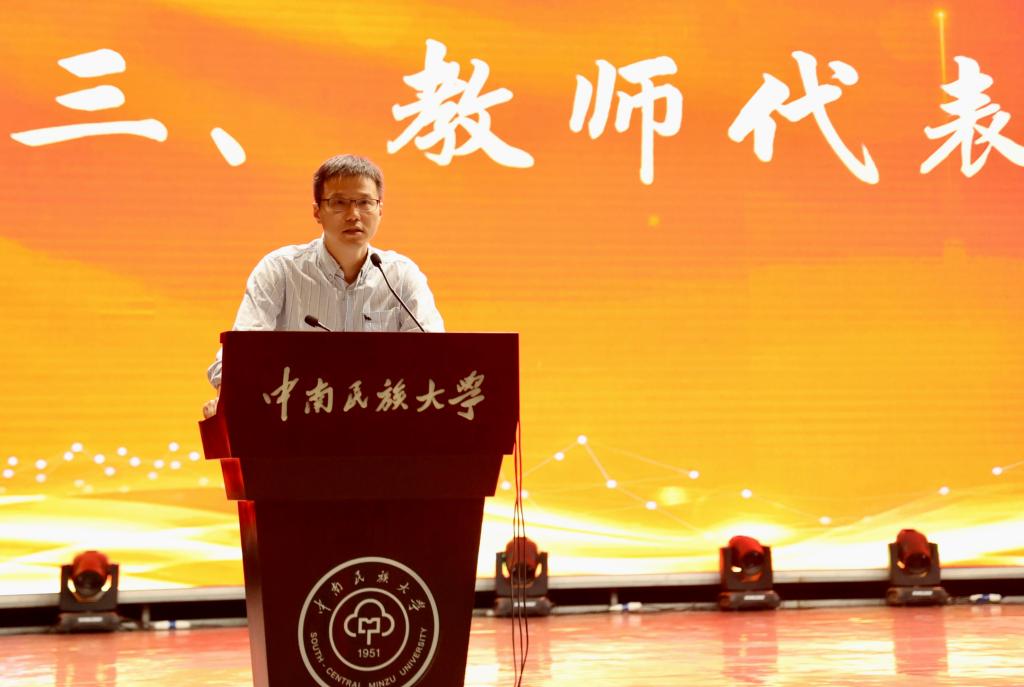 教師代表李峰結合自己在民大多年的學習工作經歷,用“過來人”身份向2023級新生對提出建議:多看、多思、多實踐。他表示大學學科的專業性、研究性學習與中小學基礎性、常識性學習存在顯著不同,鼓勵同學們勤學多問,獨立思考。