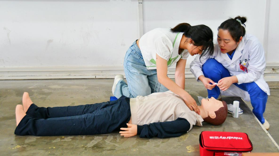 在理論知識講授環節,公共衛生科科員楊冰老師用生動易懂的語言,向學生們講授了中暑、溺水、心肺復蘇、酒精中毒方法、氣管異物梗阻等急救方法以及常見急癥與意外傷害的處理等急救知識。在培訓過程中,學生們聚精會神地聽著老師的講解。同時,護理部護士長徐佳妮進行示范操作和現場演練