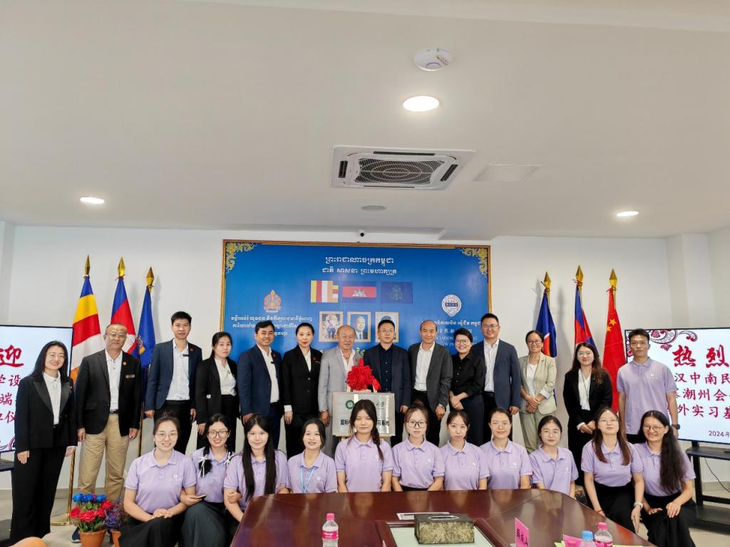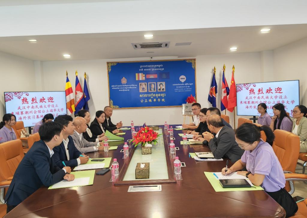 覃瑞一行受到了柬埔寨潮州會(huì)館和公立端華學(xué)校的熱情歡迎,會(huì)館副秘書長(zhǎng)吳啟祥先生,公立端華大學(xué)校長(zhǎng)吳楠楠女士及教務(wù)處、訓(xùn)導(dǎo)處等部門負(fù)責(zé)人,我校在柬國際中文教育志愿者代表和實(shí)習(xí)生一起參加了“中南民族大學(xué)國際中文教育海外實(shí)習(xí)基地”掛牌儀式和座談。