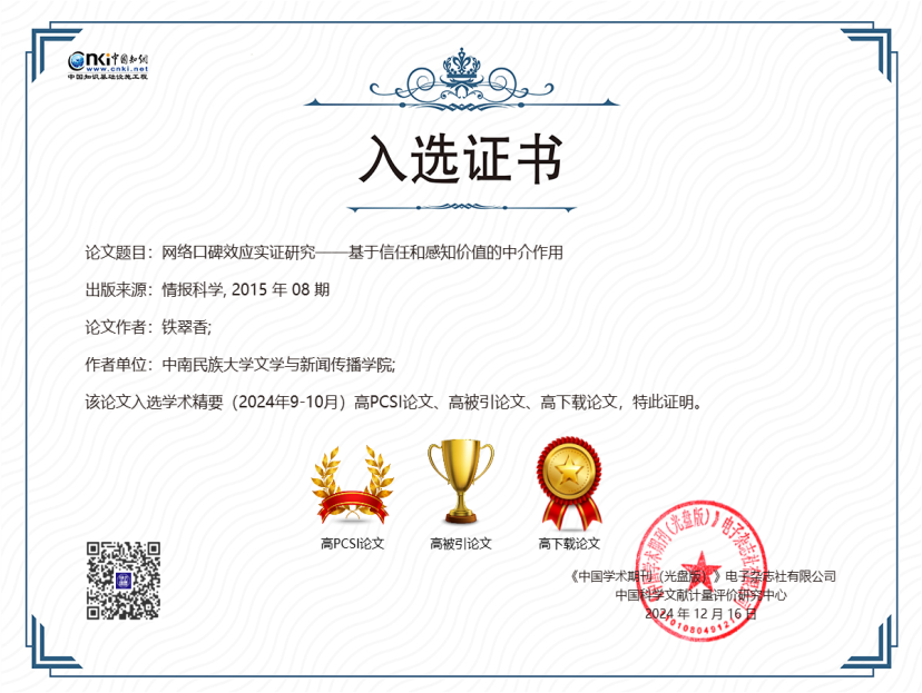 鐵翠香副教授團隊依托中南民族大學文學與新聞傳播學院、國家級一流廣告學專業和民族品牌傳播研究團隊平臺,主要從事品牌傳播和消費行為方面的研究。發表的相關成果曾獲中國知網學術精要(2024年9-10月)高PCSI論文、高被引論文及高下載論文證書。