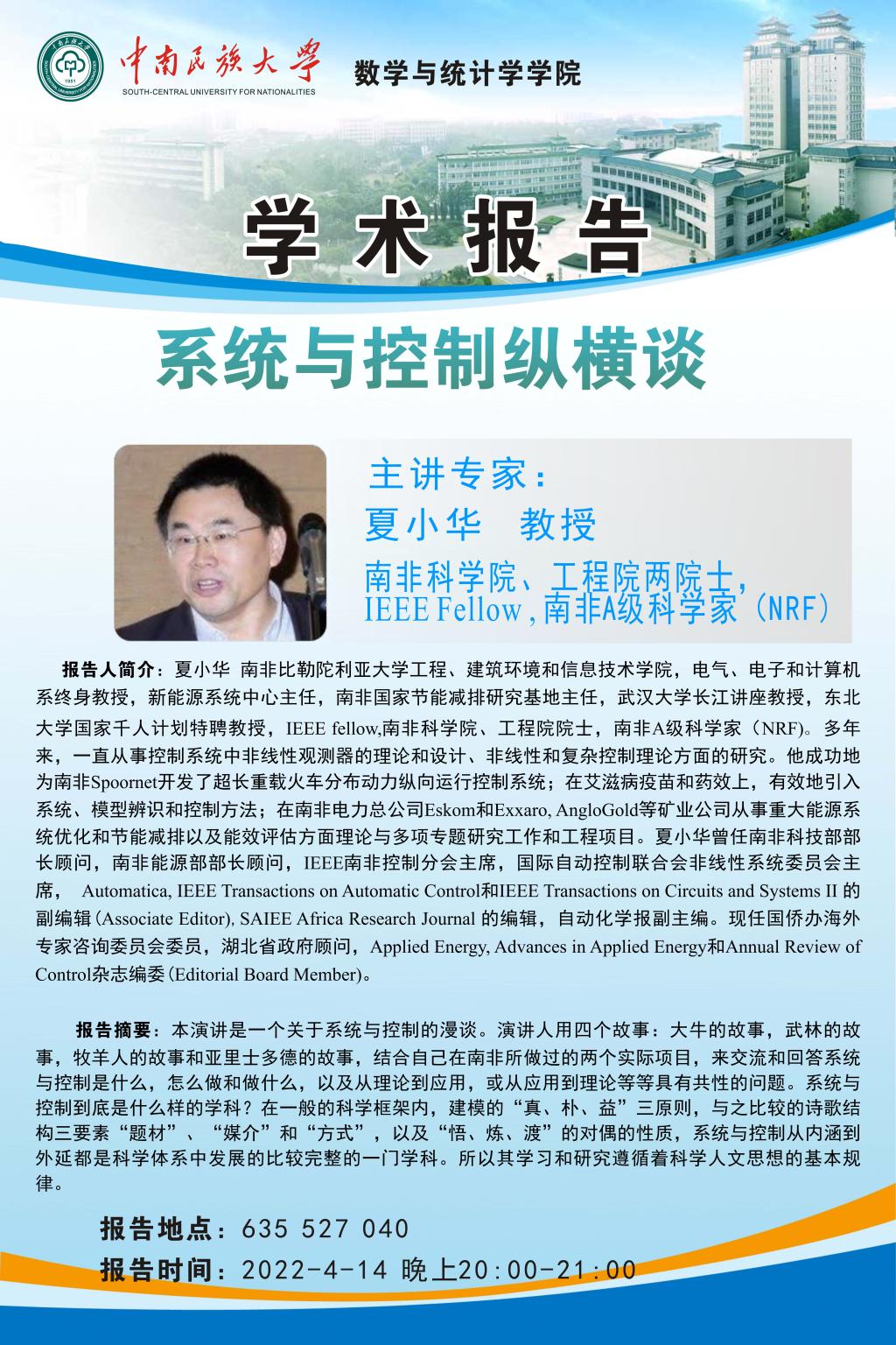 【學(xué)術(shù)講座】4月14日南非科學(xué)院夏小華教授學(xué)術(shù)講座通知