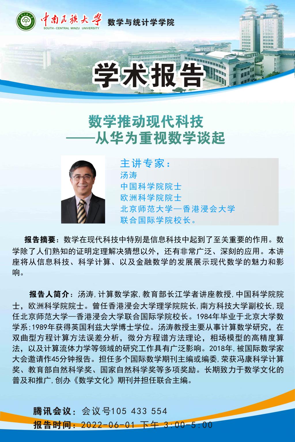 【學術講座】6月1日中國科學院湯濤院士學術講座通知