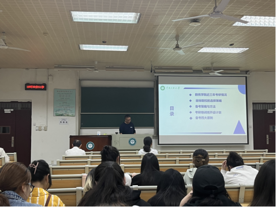 數學與統計學學院副院長朱忠熏從考研報名、招生政策、專業代碼、分數趨勢、調劑申請、少干計劃、本科生考研和研究生就業等八個方面做了介紹,他詳細講解了考研備考的各環節流程和重點注意事項,結合過去一年學院研究生招生、錄取以及就業的情況,建議同學們認清考研形勢,科學規劃復習備考方案,合理選擇目標院校及專業。