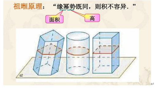 祖沖之和他的兒子祖暅編寫了一本名為《綴術(shù)》的專著,這本書在唐代初期被選作國子監(jiān)算學(xué)館的教材之一。據(jù)說《綴術(shù)》的內(nèi)容十分艱深、是唐朝算學(xué)中最難的課本,所以習(xí)者寥寥。在北宋元豐七年(1084年)時?便已經(jīng)失傳,非??上??!毒Y術(shù)》中有云:“緣冪勢既同,則積不容異”。意思是說:如果兩個立方體的所有等髙的橫截面積全都相等, 那么這兩個立方體的的體積一定是相同的。這正是“不可分量”思想的延續(xù)。這個原理我們稱之為“祖暅原理”,在微積分里被西方稱為卡瓦列里(Cavalieri)原理。祖暅原理的發(fā)現(xiàn)比卡瓦列里原理早1000 多年。 祖暅承襲了劉徽的思想,利用祖暅原理求出“牟合方蓋”的體積,進而利用“牟合方蓋”求出了球體的體積,解決了劉徽所遺留的問題。