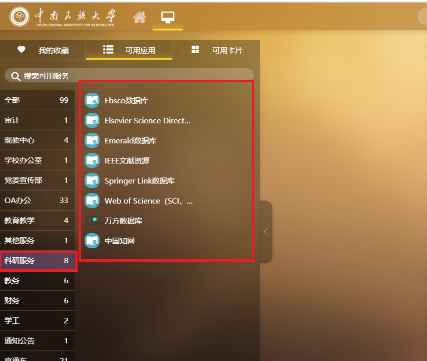 2、認(rèn)證成功后,在左側(cè)“可用應(yīng)用”選項(xiàng)卡中查找“科研服務(wù)”,點(diǎn)擊相關(guān)電子數(shù)據(jù)庫資源即可直接進(jìn)入 查詢 或 下載 電子資源(無需使用VPN認(rèn)證),如下圖所示: