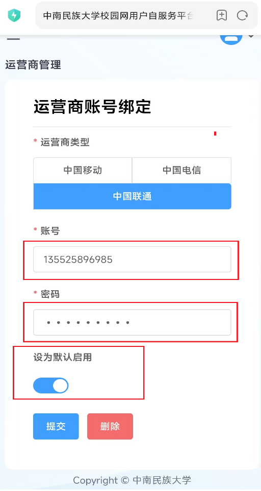 進入WebVPN系統后,在“業務系統”菜單中查找校園網用戶自服務平臺(如圖3所示),點擊進入校園網用戶自服務平臺(https://selfservice.scuec.edu.cn),選擇相關運營商,并填入所分配的光網賬號,并將“設為默認啟動”按鈕開啟,點擊“提交”按鈕完成上網類型綁定(如圖4所示,以“中國聯通”為例)。