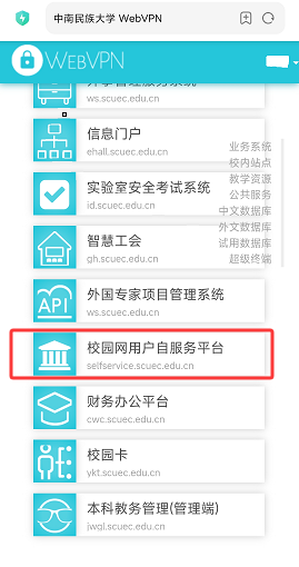 圖2 WebVPN登錄界面圖 圖3 校園網用戶自服務平臺