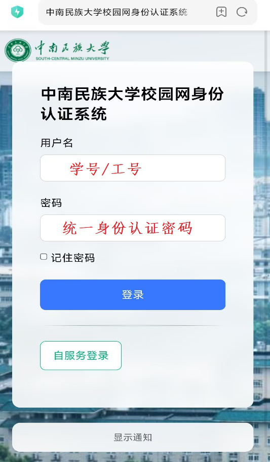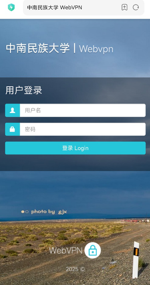 ·運營商用戶:需移步至校內運營商營業點辦理相關套餐(注冊)。辦理完成后,進入中南民族大學WebVPN系統(https://webvpn.scuec.edu.cn),用學號和統一身份認證系統密碼登錄(如圖2所示)。
