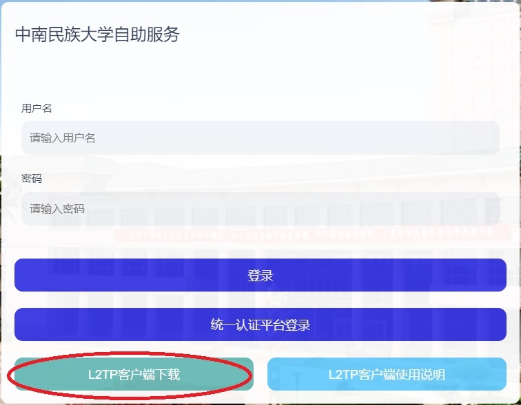 待IP地址獲取成功后,打開瀏覽器,地址欄輸入http://192.168.21.38,進入“校園網用戶自助服務平臺”,點擊“登錄”按鈕下方的“l2tp客戶端下載(點擊下載)”鏈接,下載并安裝校園網客戶端,如圖1所示: