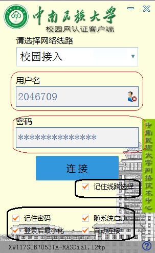 客戶端底部的復選框支持記住密碼、自動連接、開機啟動等功能,建議在自己電腦上使用客戶端認證時可勾選上述信息。