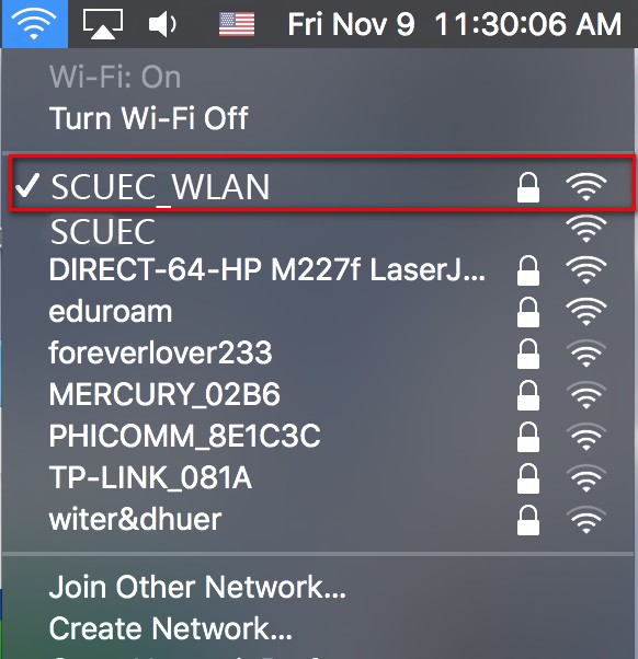 目前SCUEC_WLAN支持所有主流終端和操作系統(tǒng),下面列出 蘋果MacOS(電腦)系統(tǒng) 的配置方法。