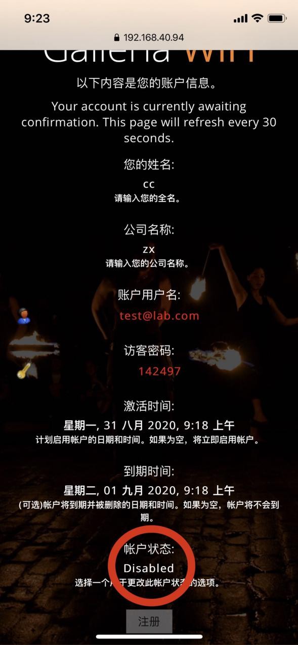 (3)點(diǎn)擊注冊(cè),成功注冊(cè)賬號(hào),此時(shí)賬號(hào)狀態(tài)為disable;
