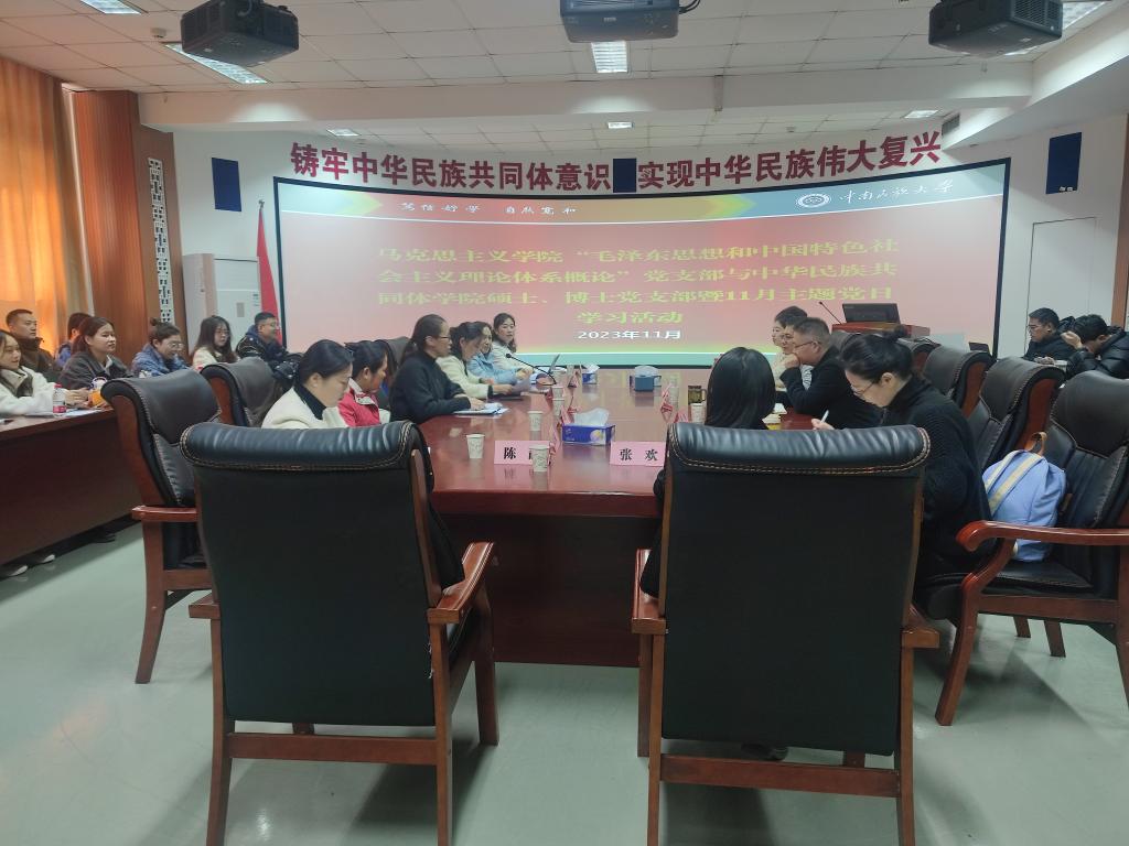 為進一步學深悟透習近平總書記在二十屆中央政治局第九次集體學習時的重要講話精神,11月22日上午,我院毛澤東思想和中國特色社會主義體系概論教研室黨支部與中華民族共同體學院碩士生黨支部、博士生黨支部聯合開展“弘揚中華民族精神,鑄牢中華民族共同體意識”主題黨日活動。中華民族共同體學院黨總支賀展書記、我院黨委副書記李建青以及三個支部師生黨員、發展對象、入黨積極分子參加活動?;顒佑晌以好珴蓶|思想和中國特色社會主義體系概論教研室黨支部書記瞿曉琳主持。