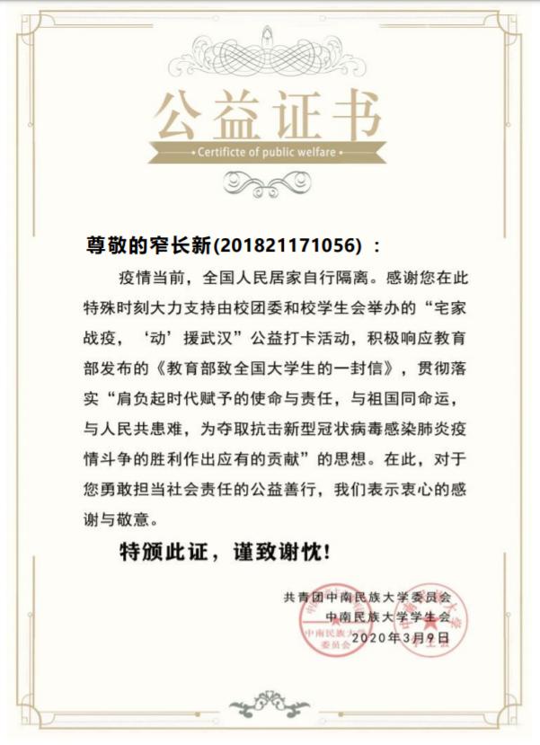 2020年的新冠肺炎疫情來勢(shì)洶洶,許多人挺身而出做了“逆行者”,感人的事跡一個(gè)接著一個(gè)出現(xiàn)在大眾的視野。“疫情當(dāng)前,很多同胞都在為病毒困擾,整個(gè)國(guó)家都受到了影響。自己就是想盡自己的一份力,去做點(diǎn)事情。”萌生出這個(gè)想法的窄長(zhǎng)新立即響應(yīng)了以我校為單位組織的“宅家戰(zhàn)‘疫’,動(dòng)援武漢”公益活動(dòng),為武漢捐款助力。他說,“黨員的責(zé)任與擔(dān)當(dāng)就意味著不能只想著自己,還要心系民族和國(guó)家,要懂得承擔(dān)和奉獻(xiàn)。”正是這樣明析著自身使命的人,才懂得如何在實(shí)踐中擔(dān)當(dāng)責(zé)任,實(shí)現(xiàn)價(jià)值。